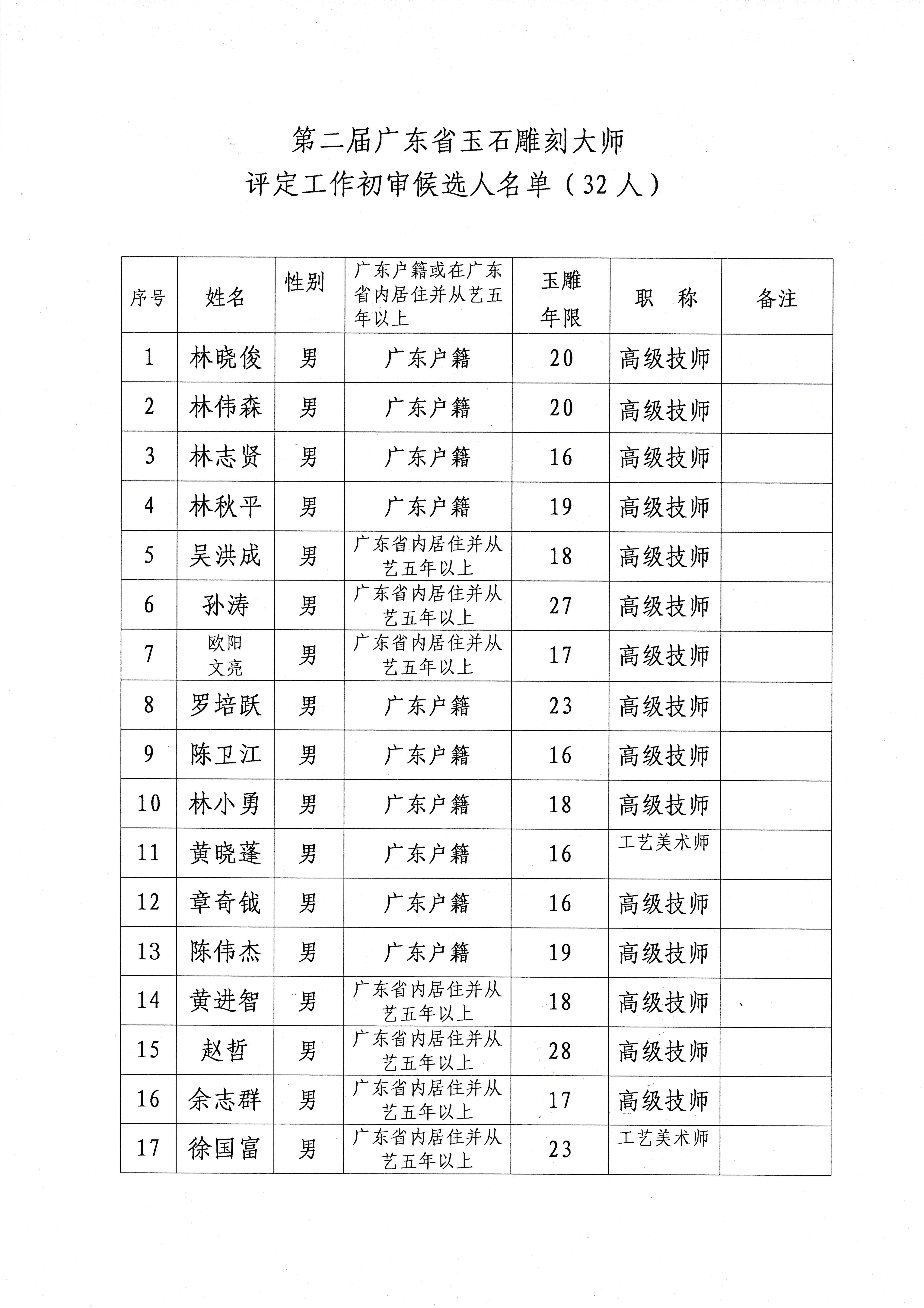 关于广东省玉石雕刻大师评定初审候选人通过名单的公示